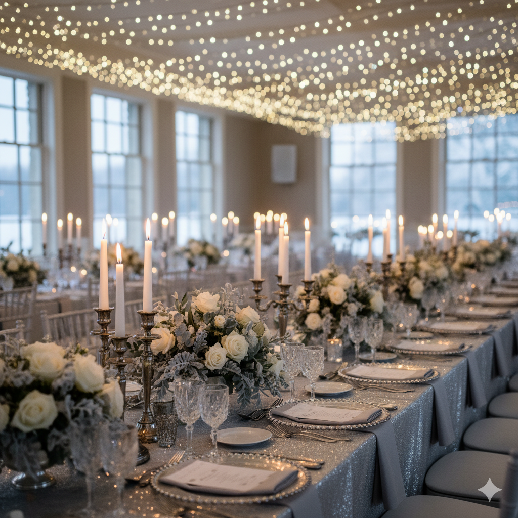 A winter wonderland reception filled with frosted florals, white roses, and crystal candle holders. Tables sparkle with silver-rimmed plates and icy-blue napkins, while fairy lights drape from above, reflecting like snowflakes.