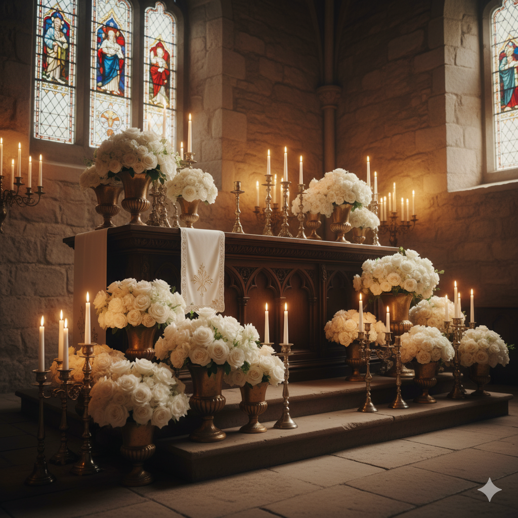 A warm, romantic altar glowing with white roses in gold urns and antique candlesticks. Ivy trails down the altar steps, giving the entire space a timeless, organic feel.